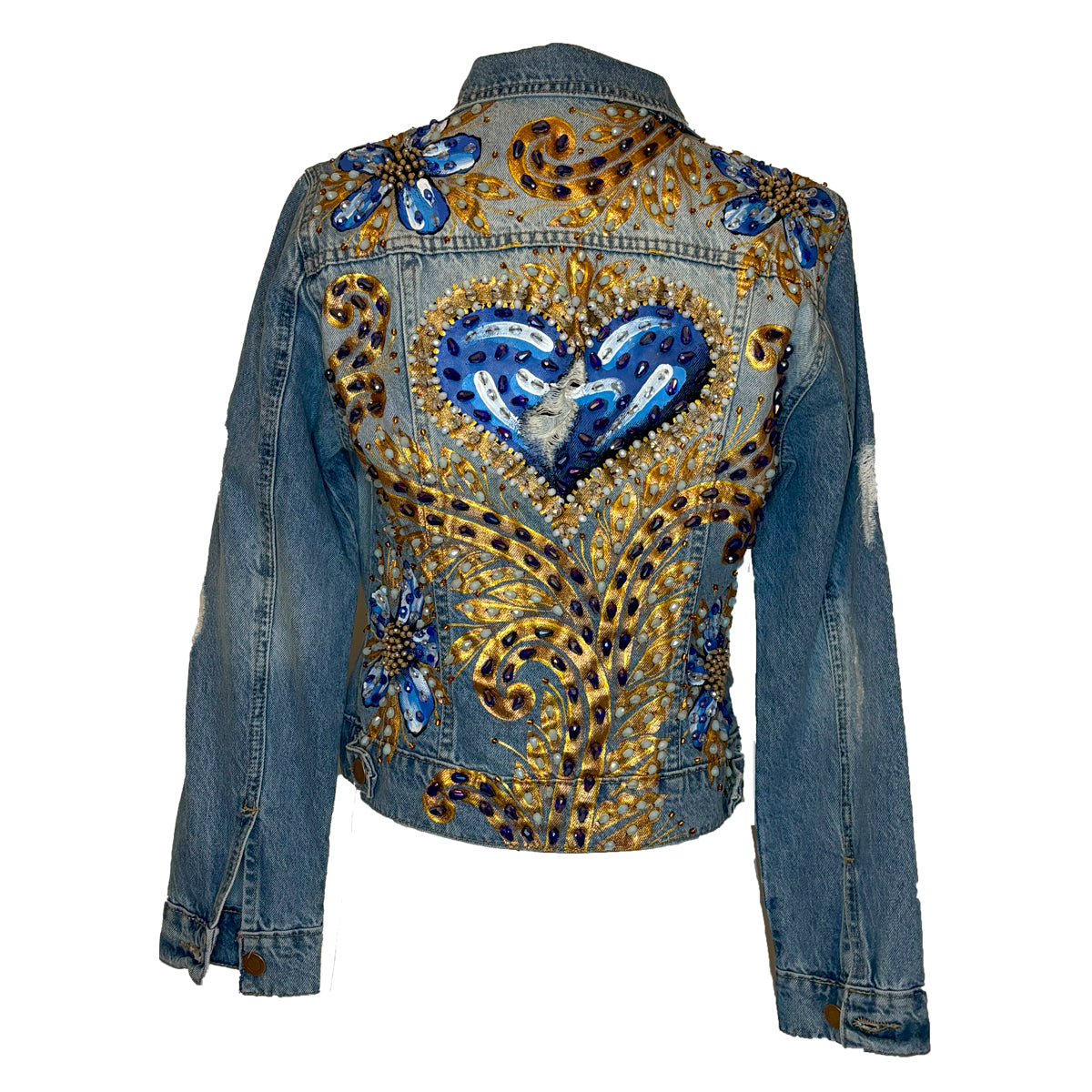 Hand Beaded, Hand-Painted Medium To Dark Wash Denim Jacket With Blue Heart In Center With 4 Blue Flowers In Each Corner On The Back