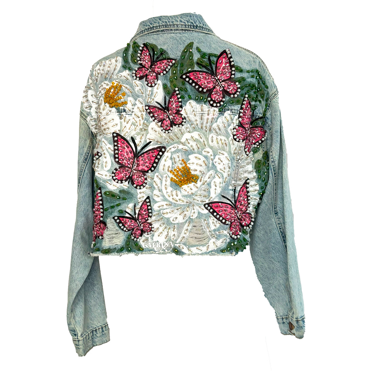 Hand Beaded, Hand Painted Light Wash Denim In Over Size Cropped With Pink Butterflies And 2 White Flowers On The Back.
