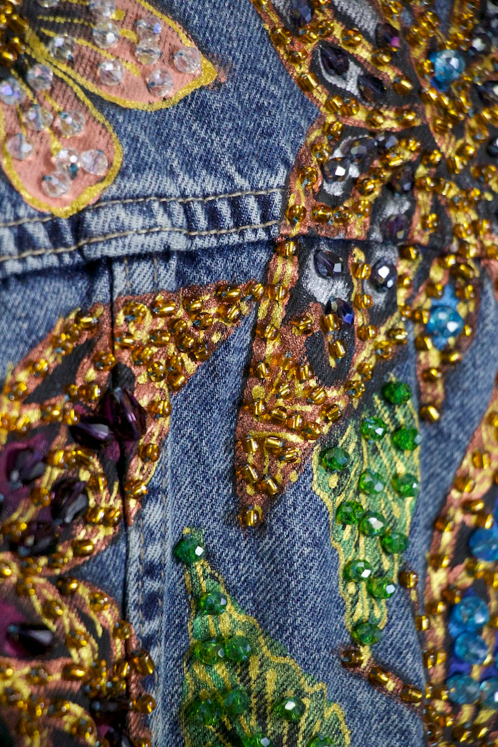 Hand-beaded and hand-painted cropped dark-to-medium wash denim jacket with intricate floral accents on the front. On the back, a dramatic longhorn skull is crowned with metallic roses and framed by colorful feathers and leaves. Every detail is elevated with shimmering beadwork.