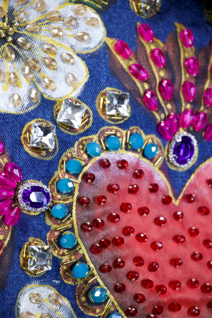 Hand-painted and beaded cropped medium-wash denim vest, featuring a striking red heart centerpiece on the back surrounded by radiant white flowers, gold detailing, and shimmering beadwork. On the front, coordinating floral and heart.