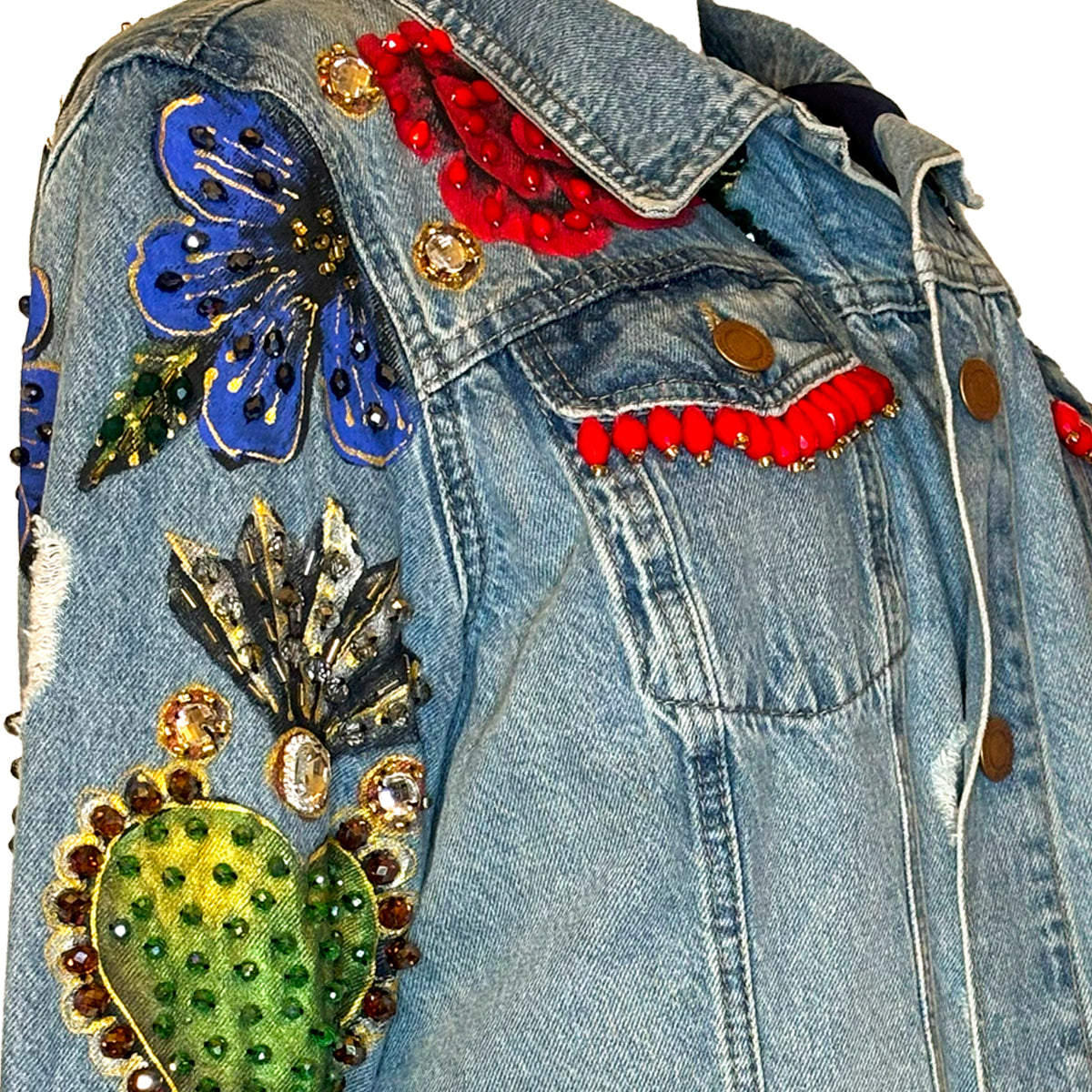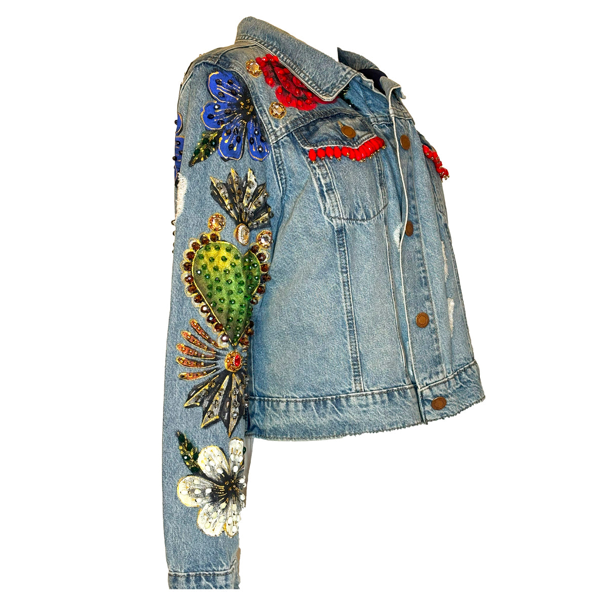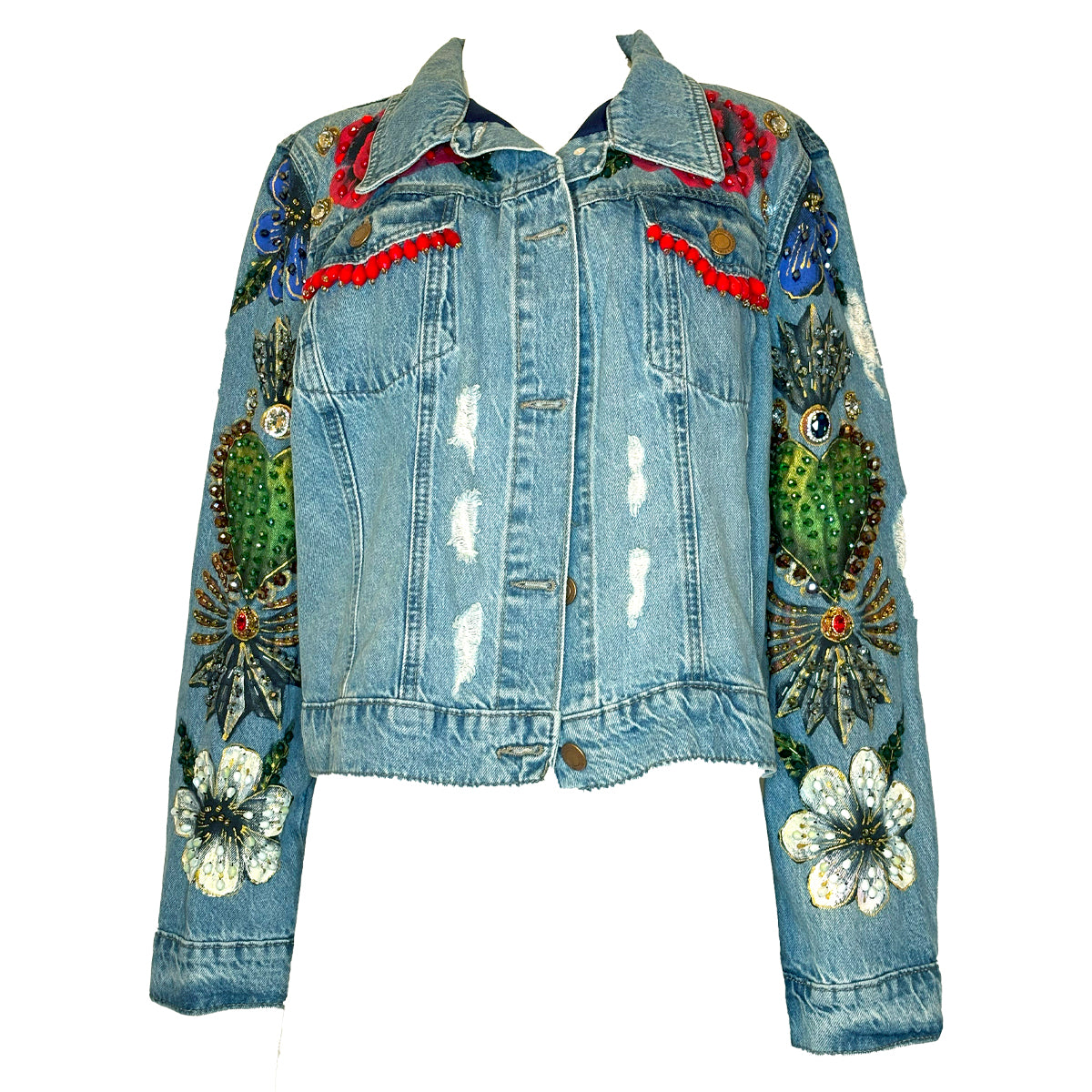 Hand-Beaded, Hand-Painted Light Destressed Denim Wash With Green Hearts And Flowers On The Back, Front And Sleeves.