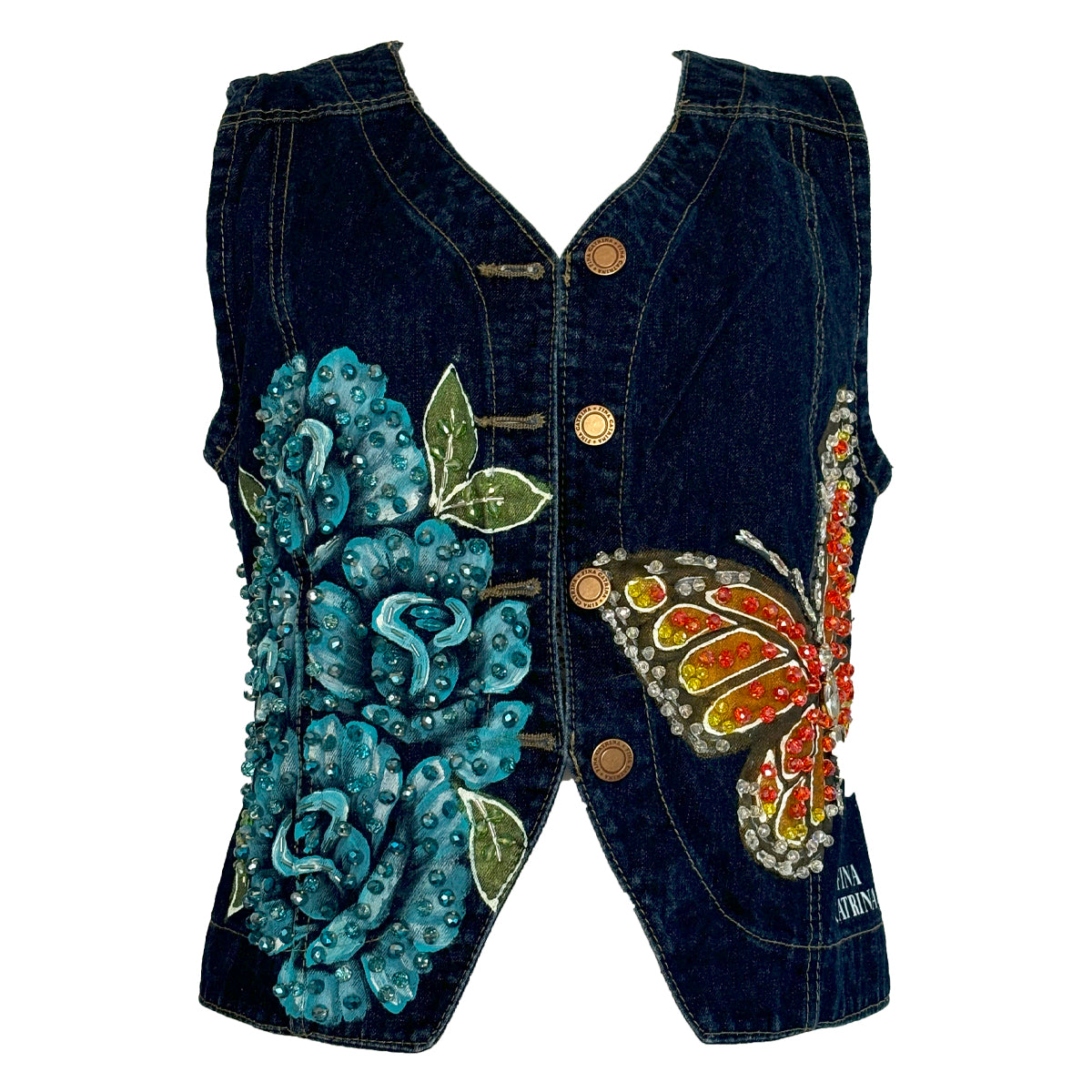 Hand-Beaded, Hand-Painted Dark Wash Denim With Big Orange And Yellow Butterfly And Blue Flowers On The Back And Front.
