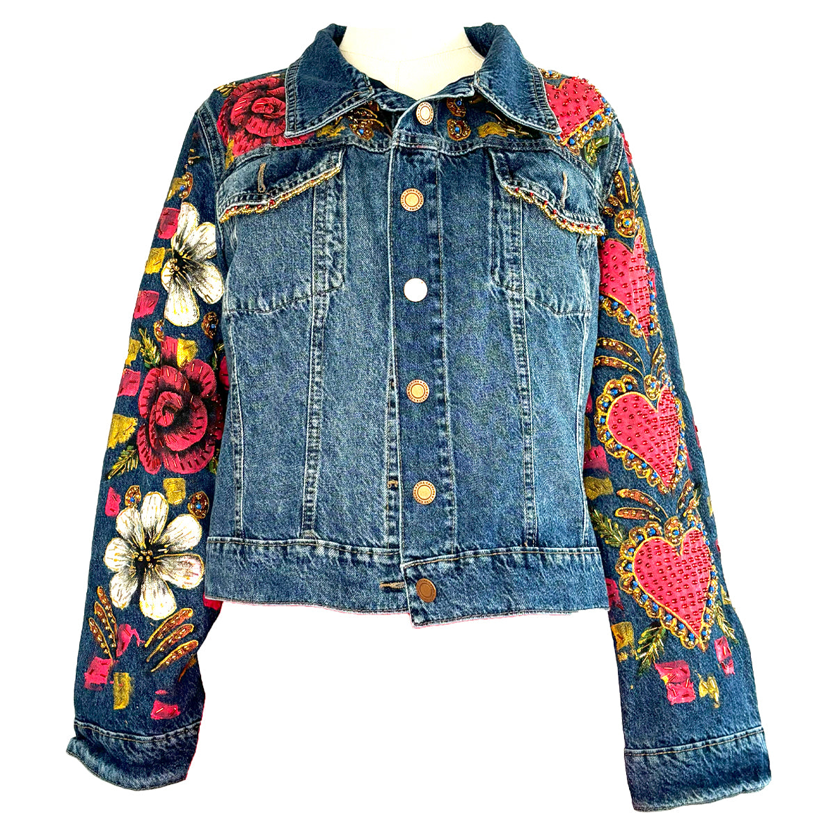 Hand-Beaded, Hand-Painted Medium To Dark Wash Denim Surrounded With Red Small Beaded Hearts and White Sequined Flowers On The Back, Front, and Sleeves.