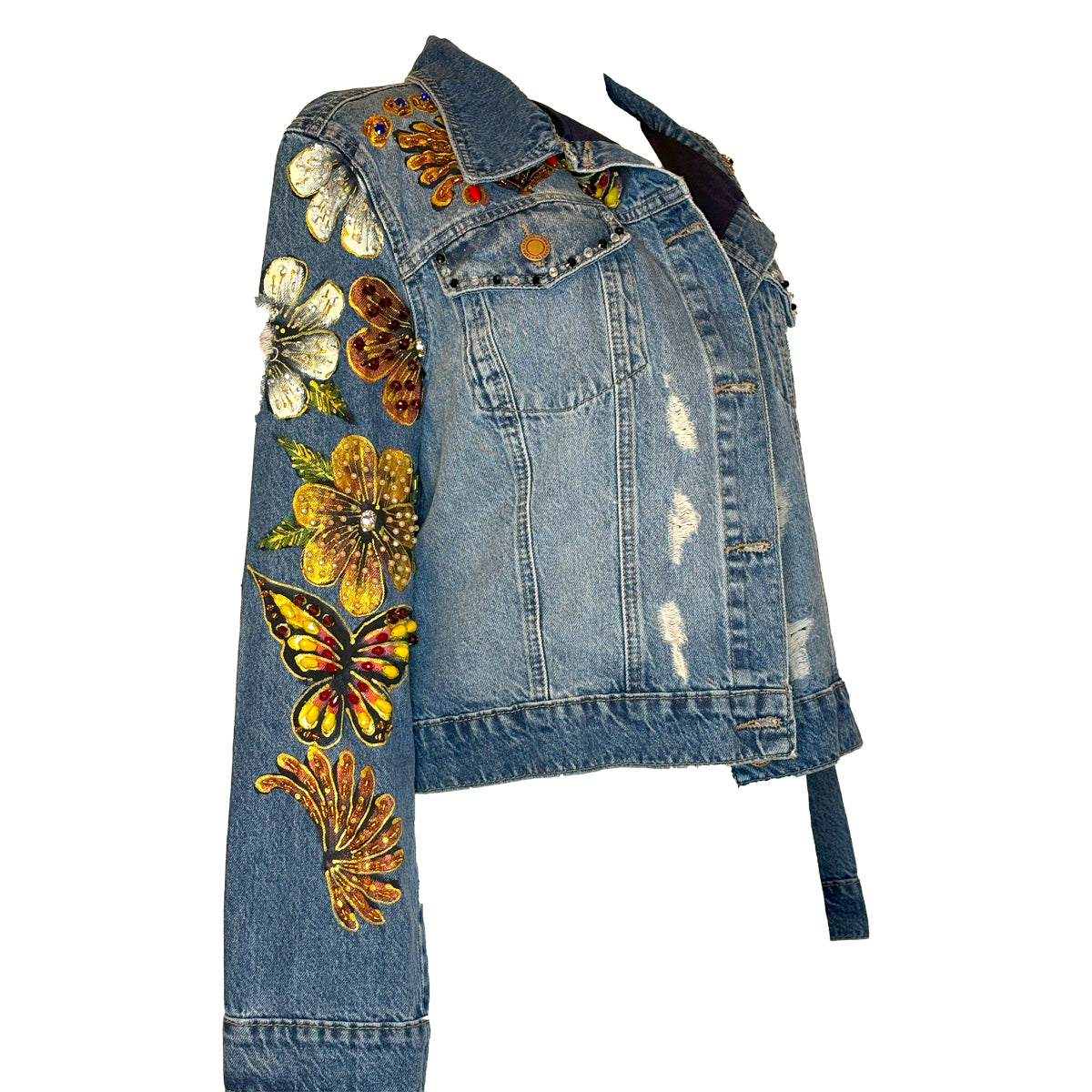 Hand-Beaded, Hand-Painted Medium To Dark Wash Denim With Jaguar, Flowers, And Butterflies On The Back, Front, And Sleeves.