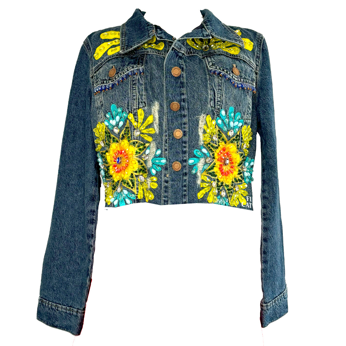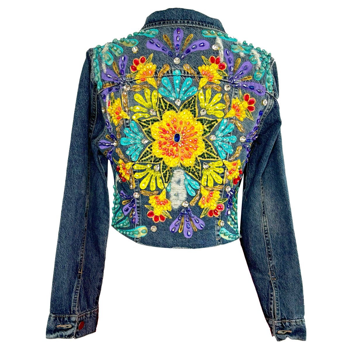 Hand-Beaded, Hand-Painted, Cropped Medium-to-Dark Wash Denim With A Colorful Mandala On The Back And Front.